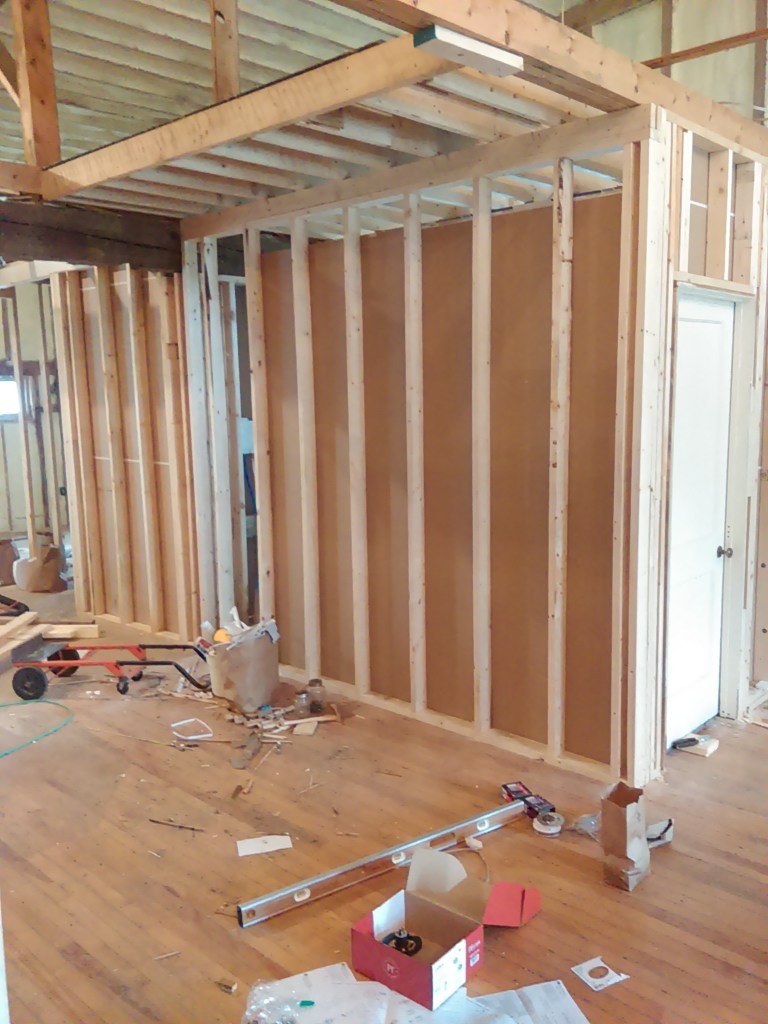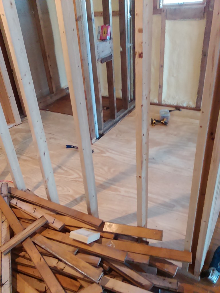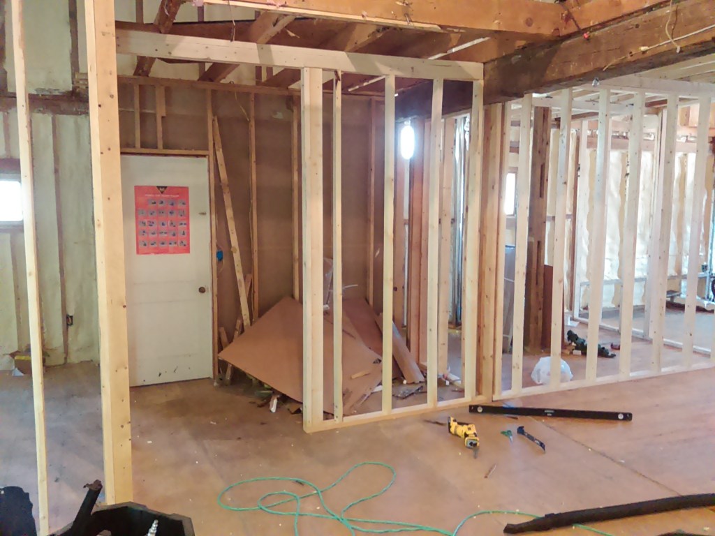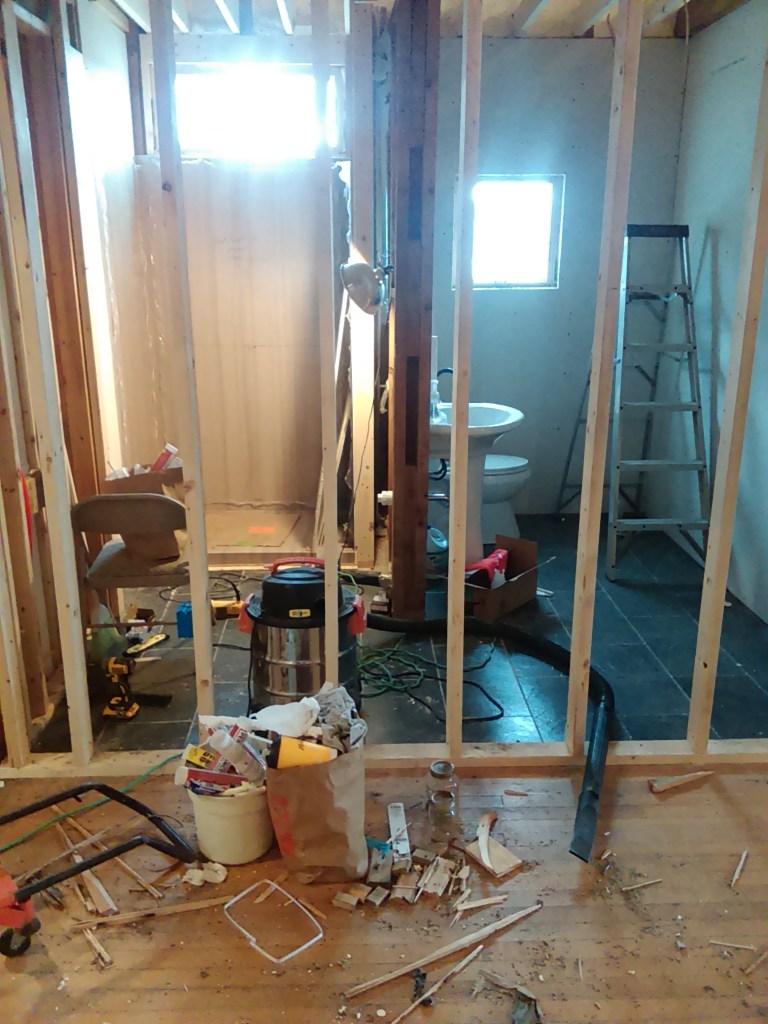 Started framing out the bathroom. Seemed a simple project but managed to mess that up about 3 times. Had planned 60 inches of width on the wall space to the left of where the bathroom would be for a washer/dryer and somehow it came out to about 55 inches on the first try. This is what happens when you work all day and then try to build in a short couple hours after work…