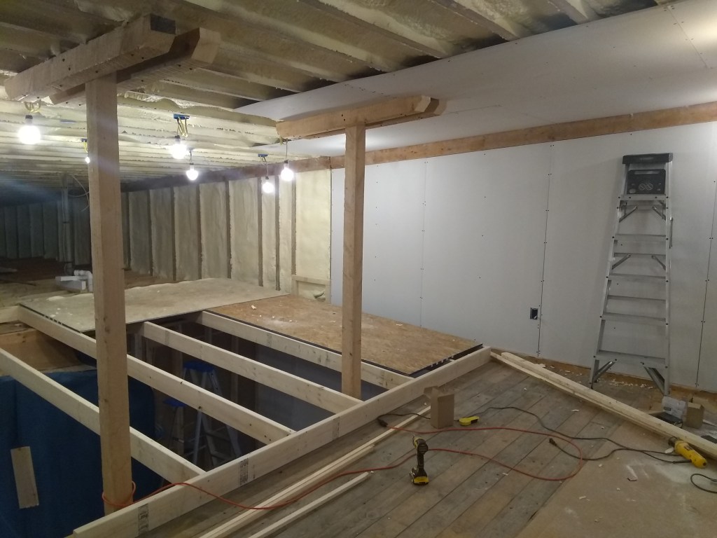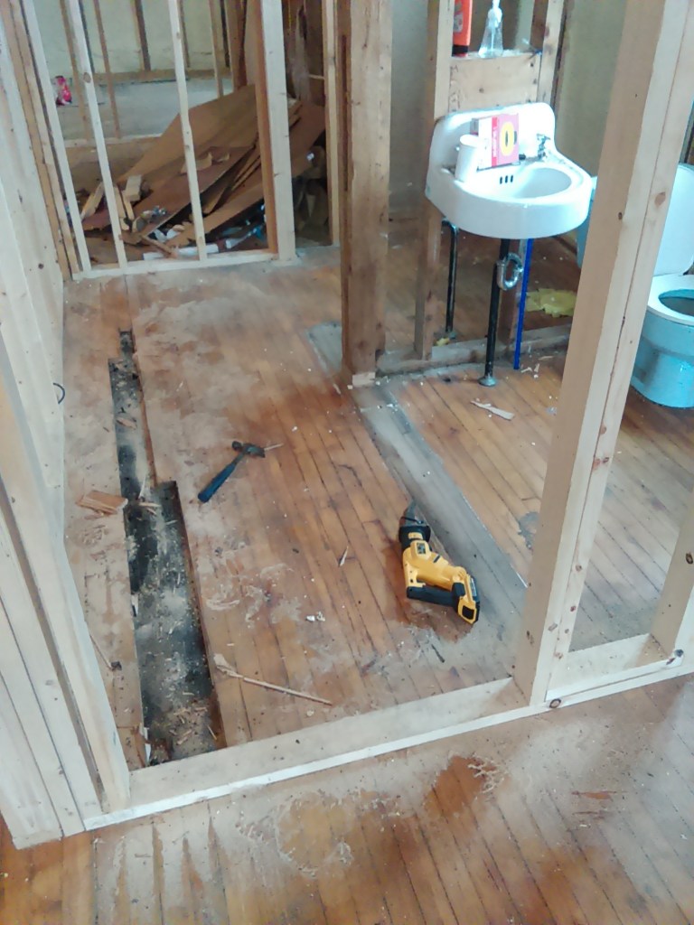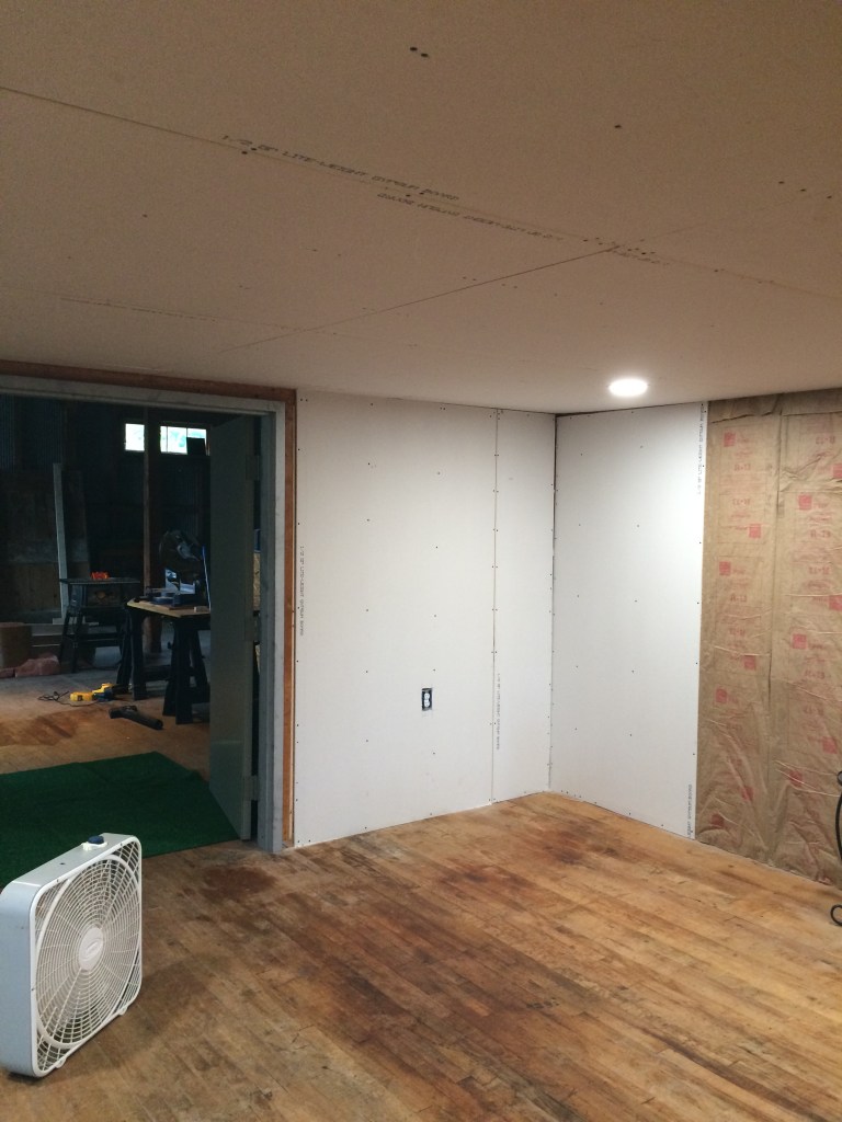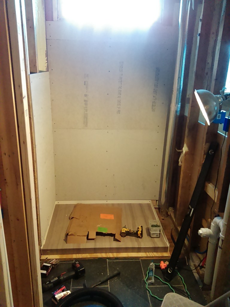 Started framing out the bathroom. Seemed a simple project but managed to mess that up about 3 times. Had planned 60 inches of width on the wall space to the left of where the bathroom would be for a washer/dryer and somehow it came out to about 55 inches on the first try. This is what happens when you work all day and then try to build in a short couple hours after work…