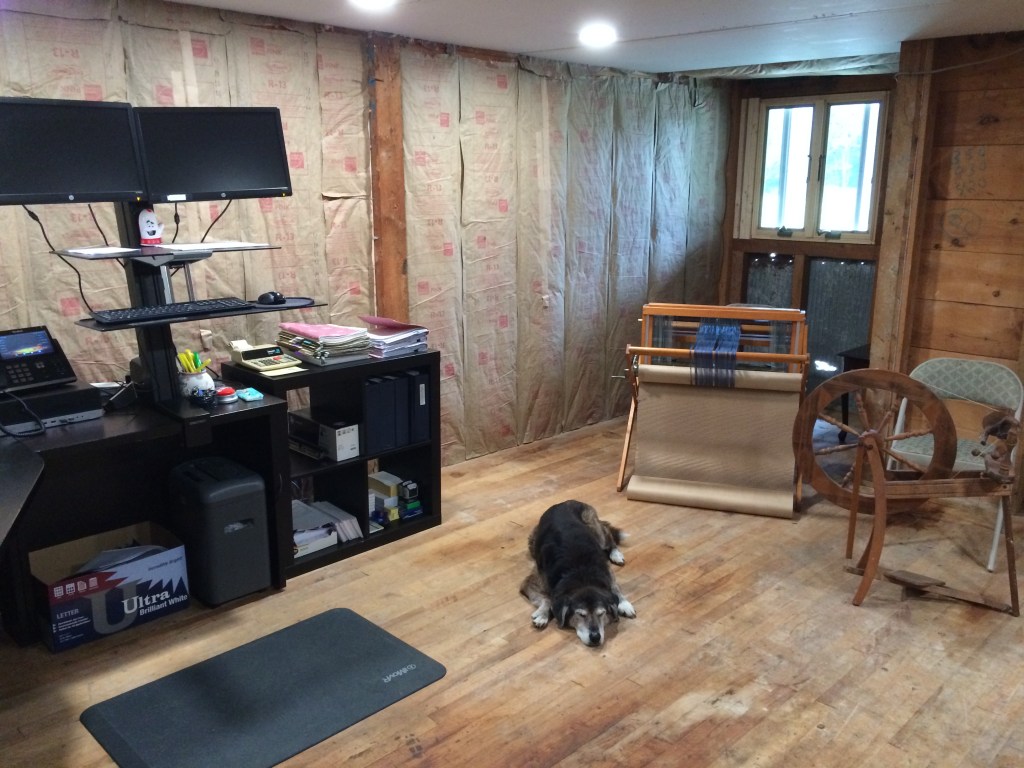 He installed two doors, a window, electricity, insulation, a ceiling, ceiling lighting, and he started sheetrocking the walls before we ran out of time. We moved my office out there yesterday, and I also set up my loom and spinning wheel.