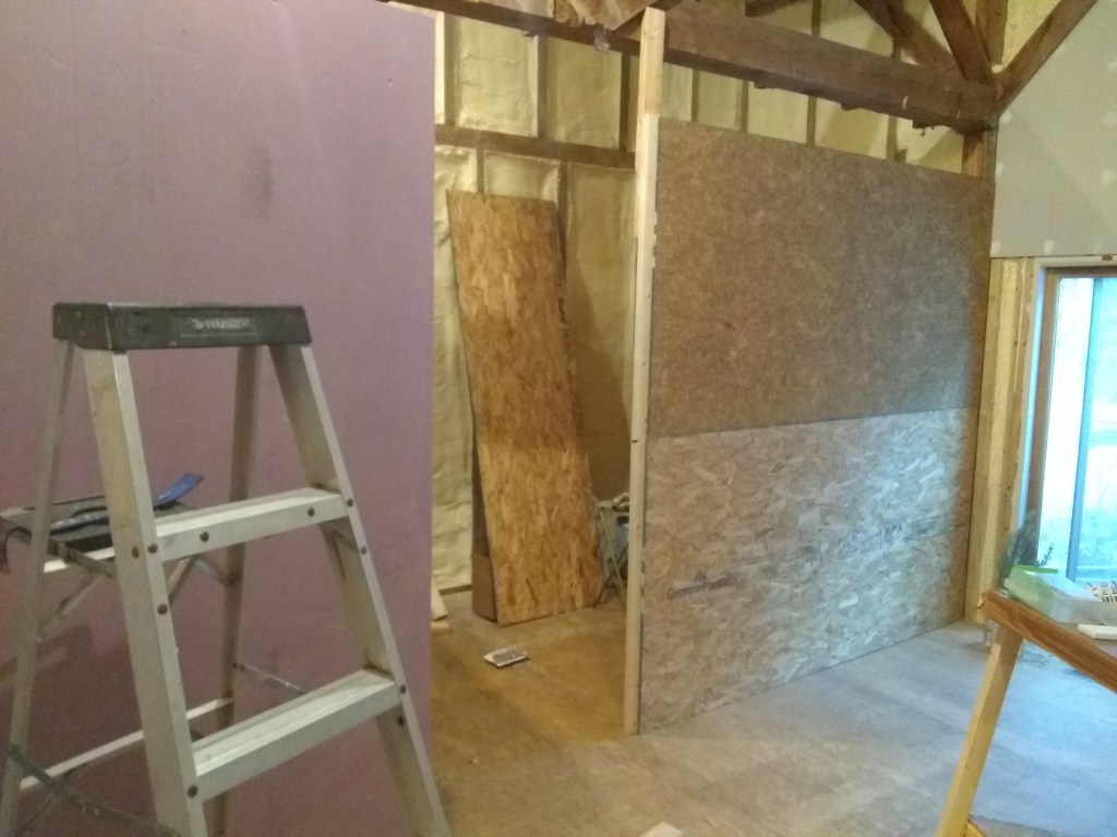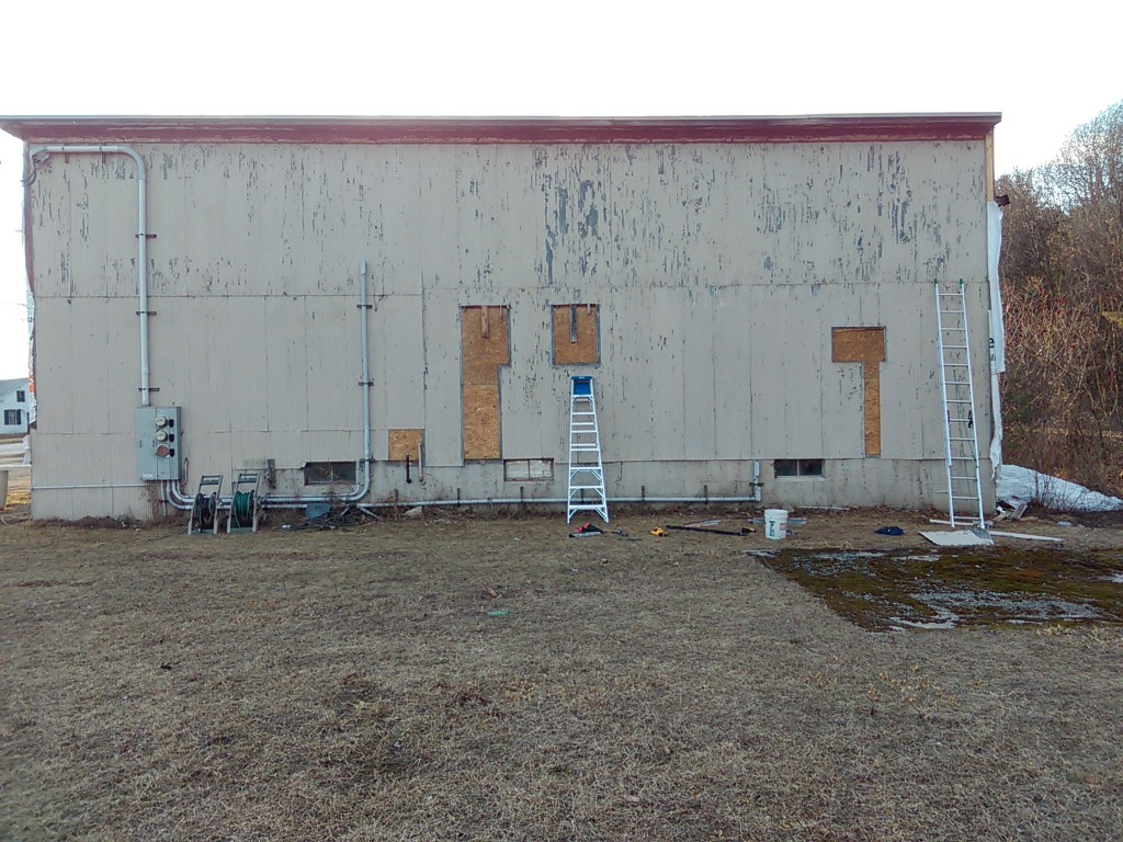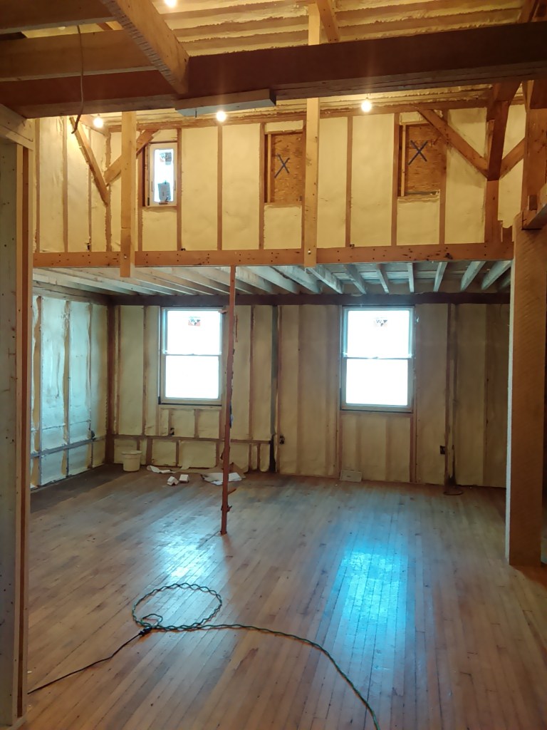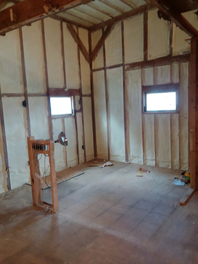 We weren’t able to get ALL of the metal siding off from the large side around where the electrical comes into the building. That will take some coordination with the electric company. So for now to keep moving forward towards getting spray foam insulation I put up some foam boards between the metal siding and the interior, so they can foam up against that instead of the metal siding and we can remove the siding later.