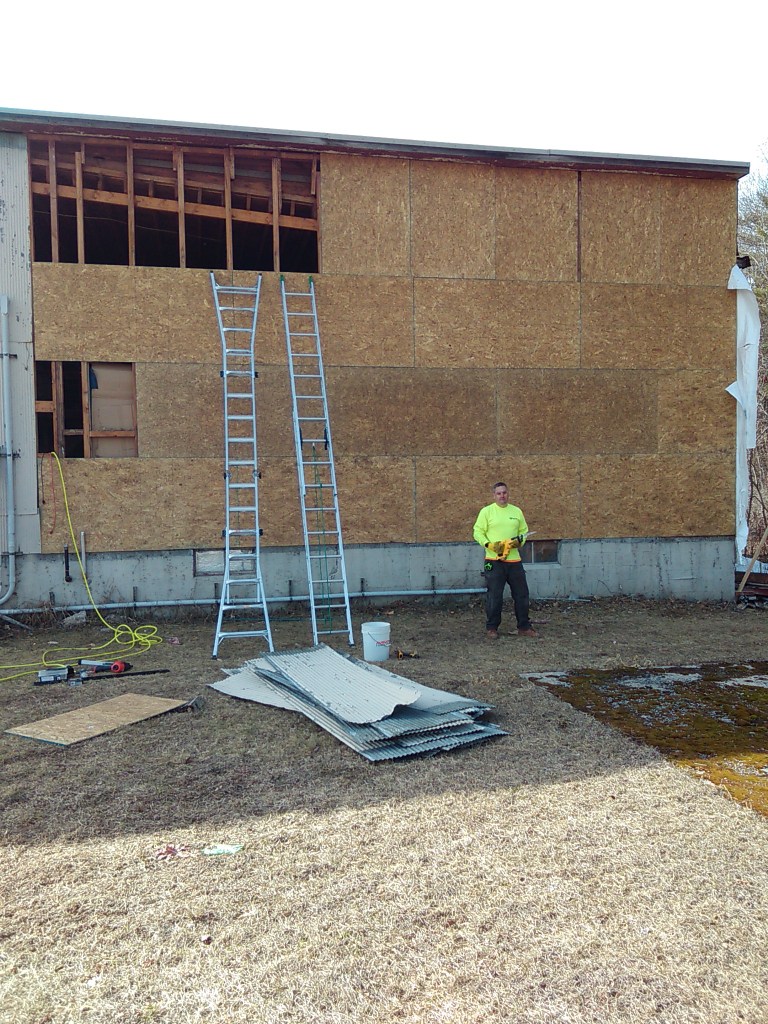 Then we began removing more of the metal siding and replacing with OSB sheathing on the front. We worked pretty late into the dark this night but got it all completed-
