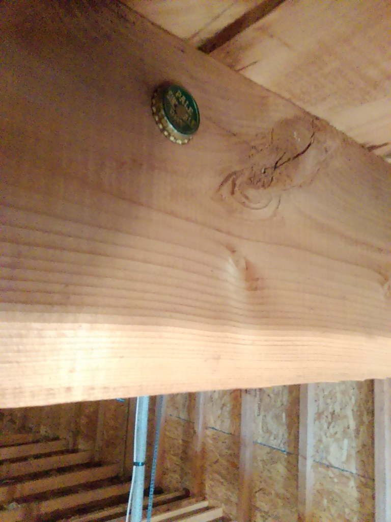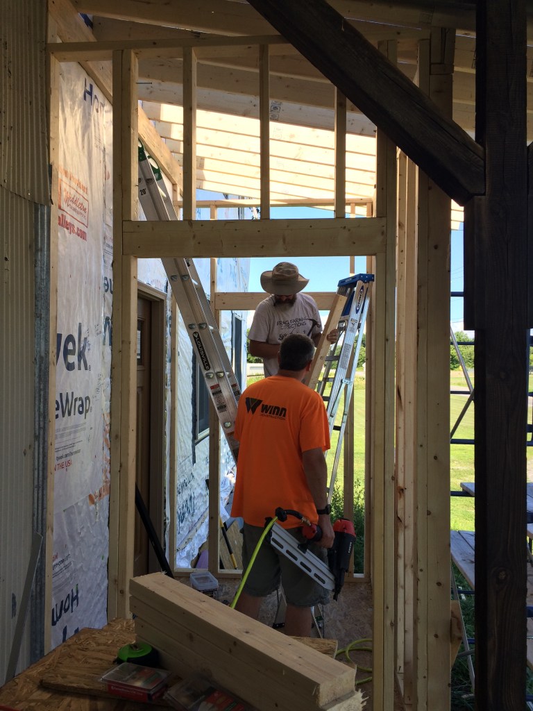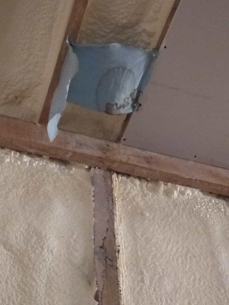 Unfortunately, we seem to have a small leak in the ceiling above our bedroom. Ruined my favorite shirt. Oh well. Hung a paper towel under it for now to catch the early leaks. Will definitely need that fixed before putting up the sheetrock there. Suppose it’s good it happened before the ‘rock was up. Been a few small leaks in that area from when the roof was repaired. The roofing co has been working their way through fixing them.