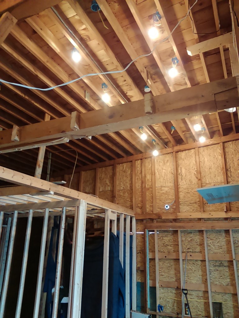 There was a lot of wiring. Primarily, I wanted a lot of smaller lights all spread out across the ceiling rather than having a few larger spotlights. We’re also adding a number of chandelier lighting fixtures and fans. They’re all wired up separately. Because I wanted the insulation as thick as possible, I opted for individual J boxes in the ceiling so the LEDs will mount over the box, sticking out a bit, but with minimal installation depth. The other option was the deeper can-light type ceiling fixtures which would’ve created a nice flush lighting but at the expense of having thinner insulation behind those cans. Because the ceiling is insulated right up against the roof, the lighting option that protruded a bit more seemed like the way to go.