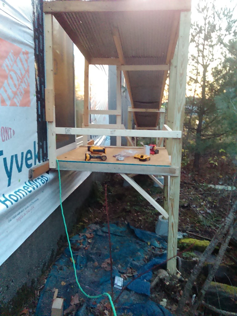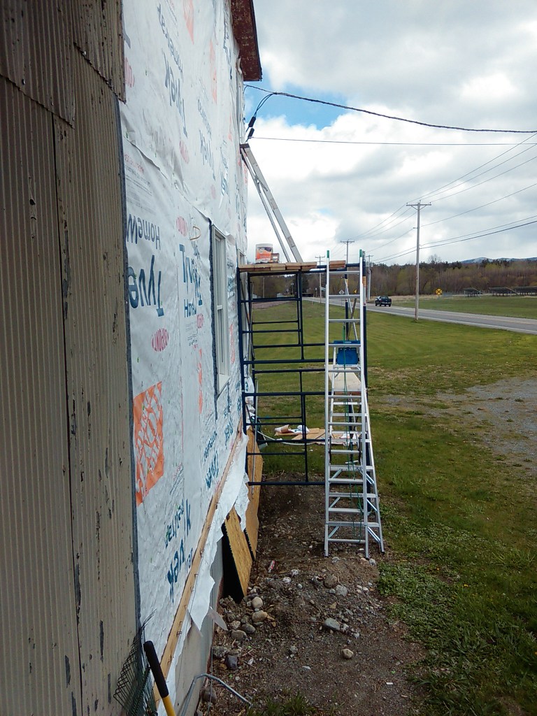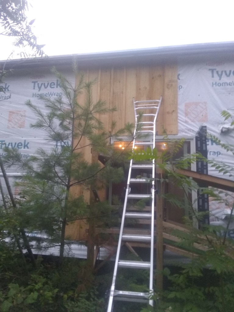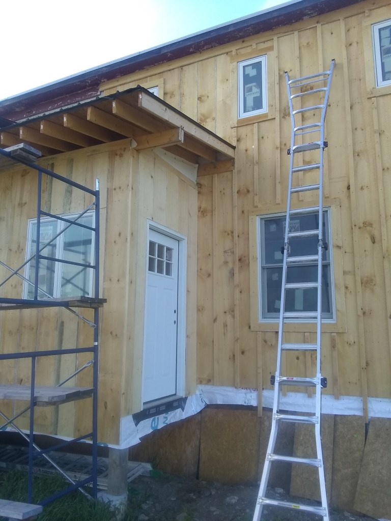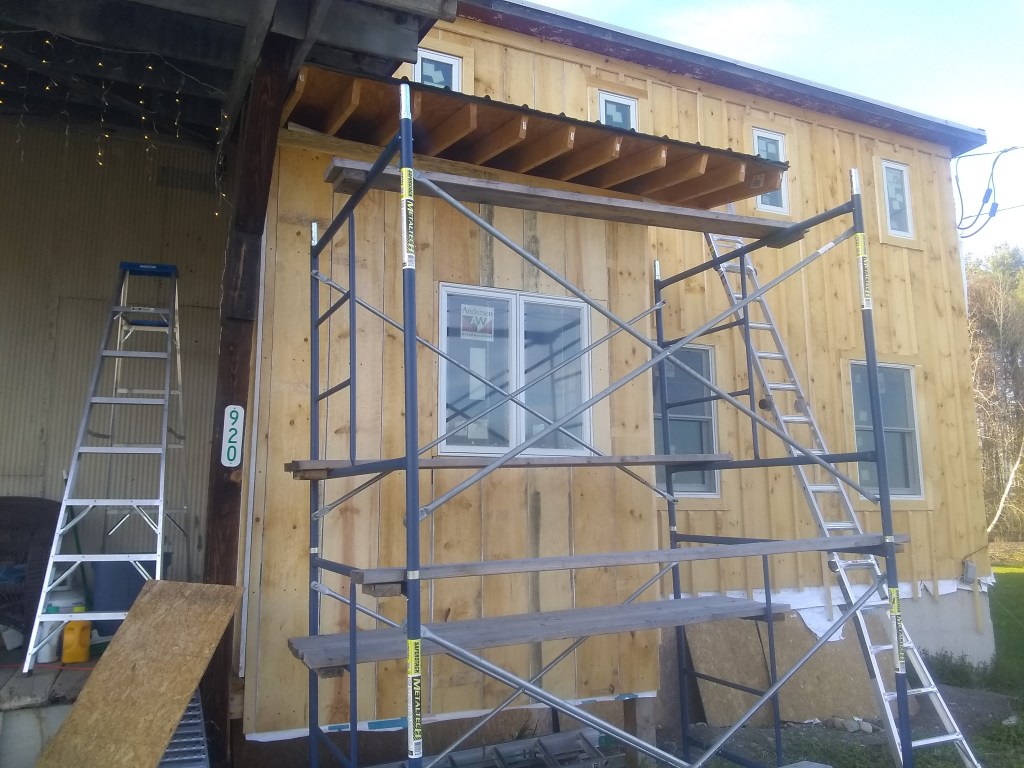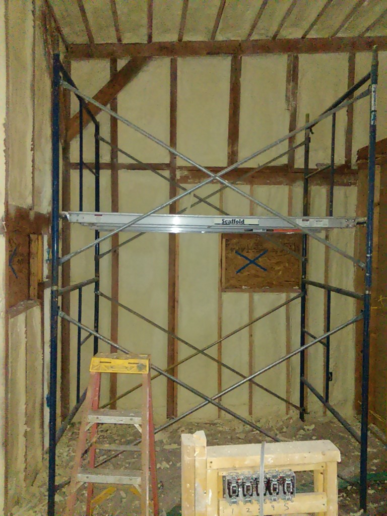 I finally had to break down and get some scaffolding. Should have gotten this a while ago; it would’ve helped with the exterior sheathing. Live and learn. Two levels of scaffolding with a ladder on top for a guy who hates heights – what could possibly go wrong here?