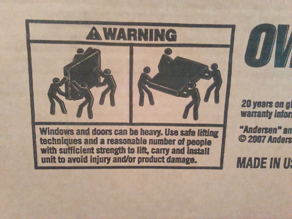 Jen and I like to have a good laugh about this image on the sliding door box which shows FOUR people lifting and moving the same door that I moved and installed myself 🙂 –