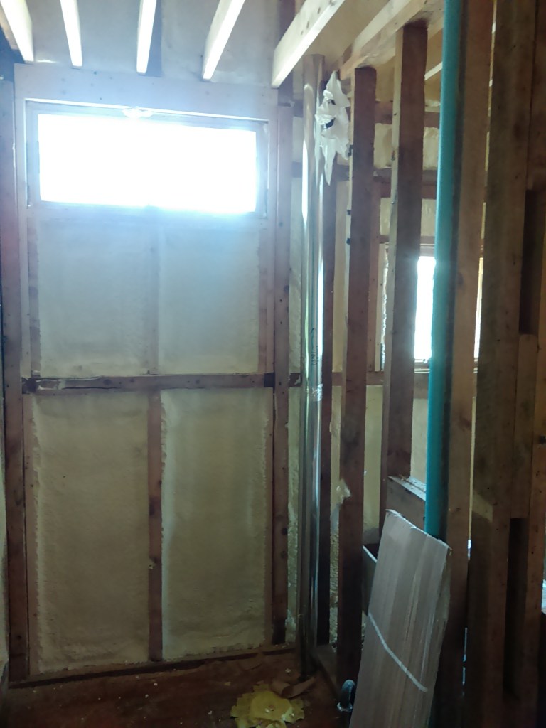Once all of the was complete, the foaming began. We chose Holmquist Builders to do the foam work. They explained things well, mentioned some things we weren’t aware of, and answered all of our questions. A crew of two guys worked just after the COVID-19 ban was eased up to allow 2-man crews back into worksites. They prepped all the surfaces, covering the important beams with plastic, set up some scaffolding and got to work. It took about a week in total.