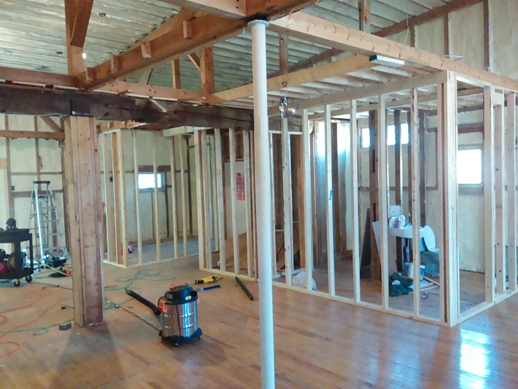The asbestos project will require that my home office be moved from the “warehome” out into the warehouse. In preparation for this, Joel has been working on finishing one of the few rooms that is out in the main warehouse. Here is a “before” picture of that room!