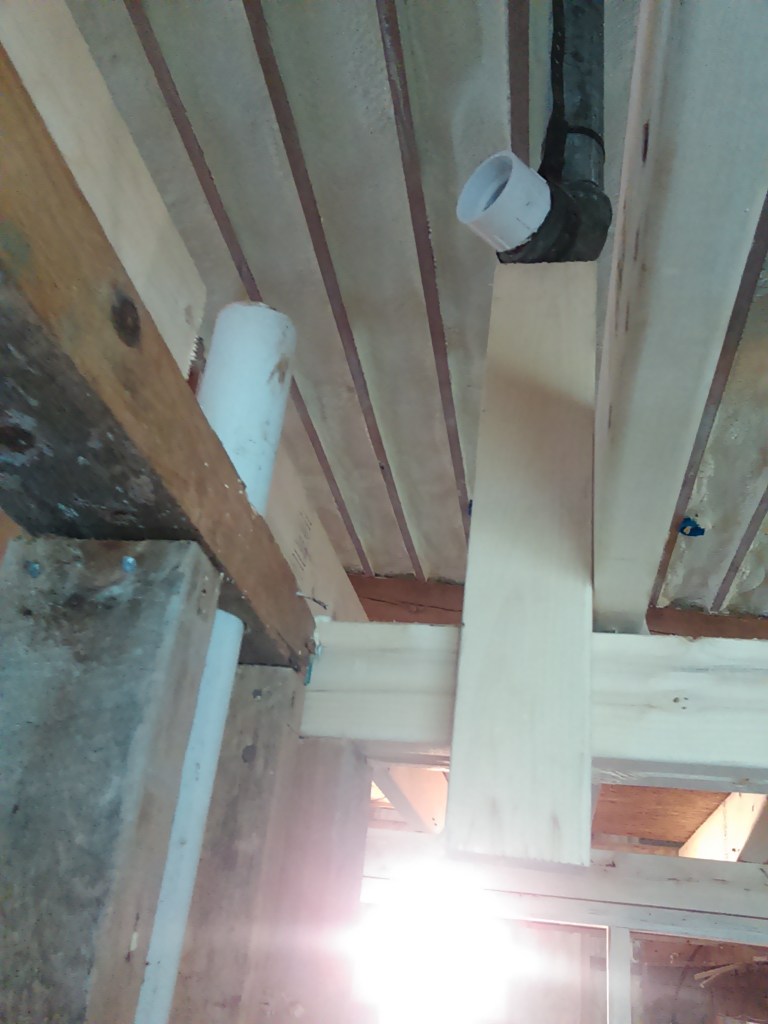 Then I needed to block off the spaces between ceiling joists above the wall that goes between warehouse and warehome. Every single one of these was a different size and needed to be individually measured, cut, and screwed into place. It took most of the day, there were at least 50 of them. Here’s a few of them with some wooden wire spool or something-