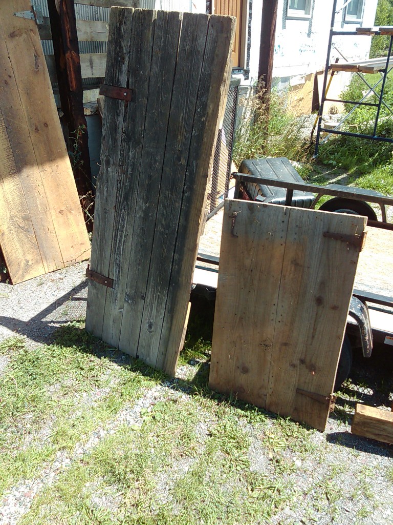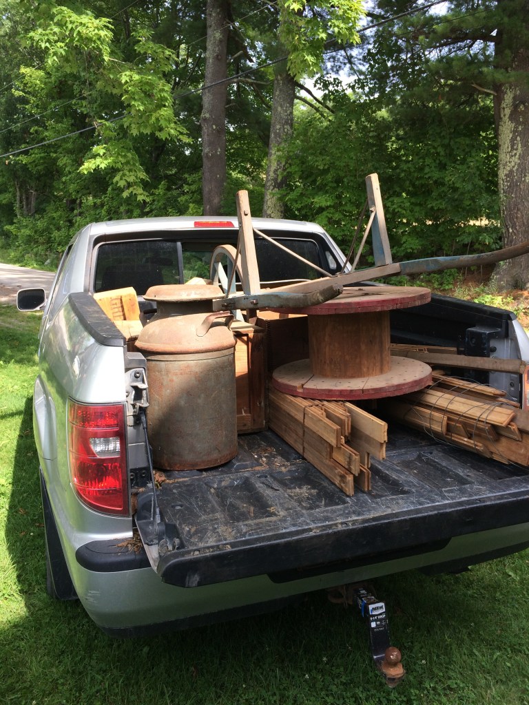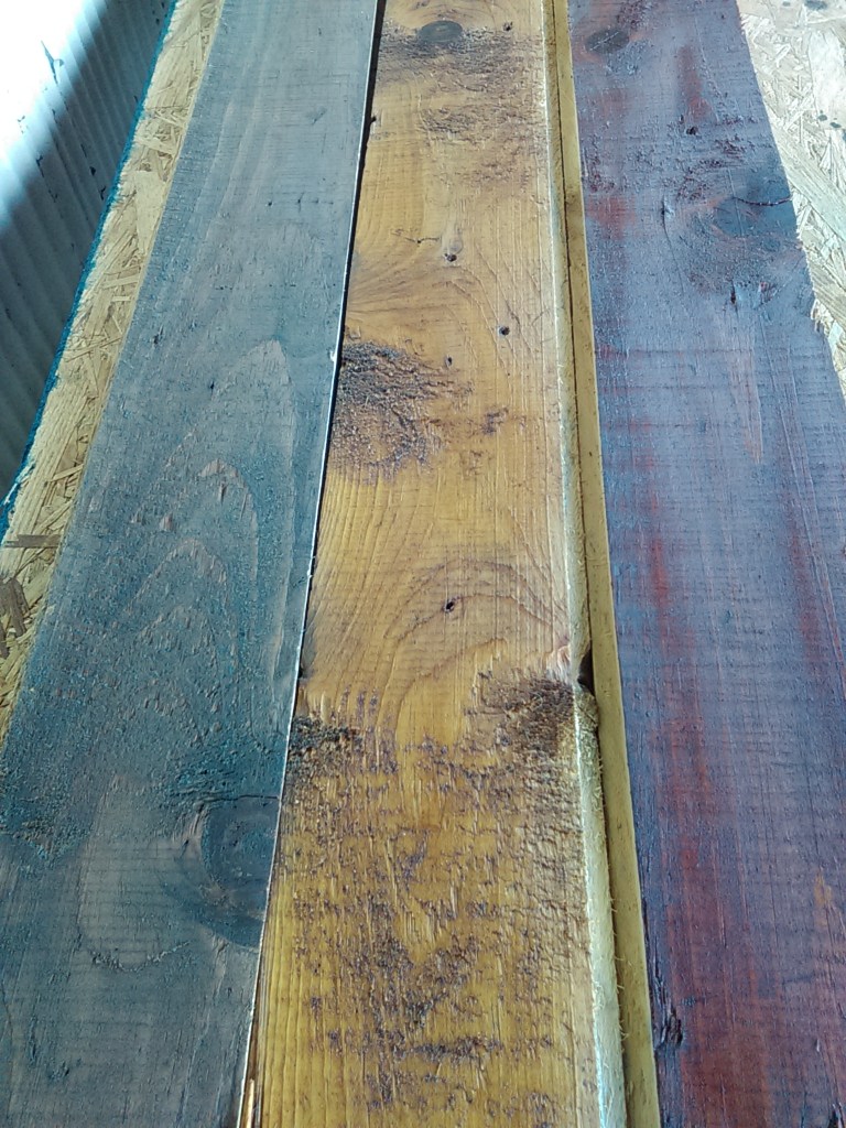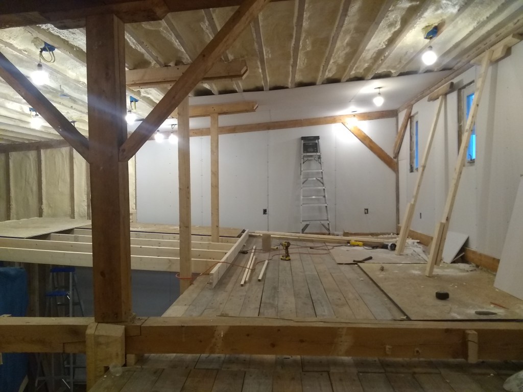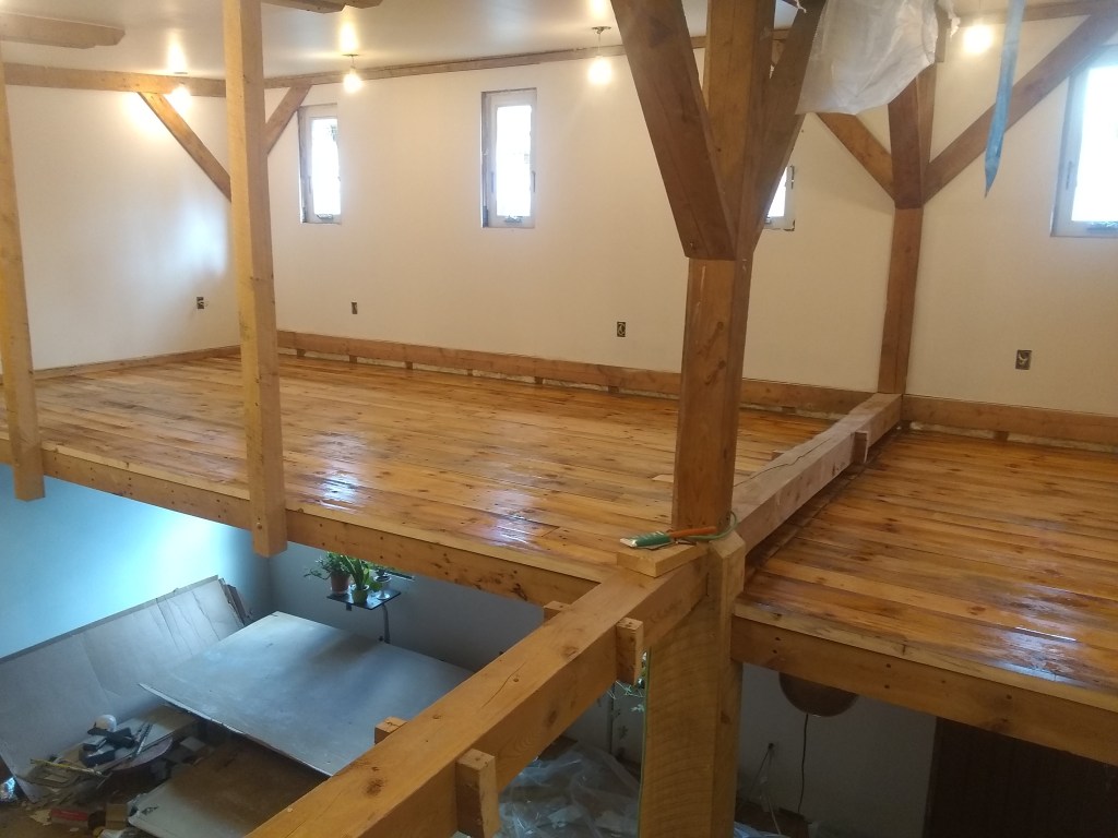 I will say I was very pleased with the result. We got all the T&G 2×6 reclaimed flooring for the loft from a guy on craigslist who pulled it out of a building he was tearing down, for cheap. Hauled it on my tiny trailer from Burlington to Fair Haven- 1.5 hours- wobbling all over the road. 16+ ft lengths on an 8ft long trailer made for a very unstable ride, esp on old Route 22A (the highway of death). But I made it. With sanding and varnishing this old wood shows a LOT of character and color-