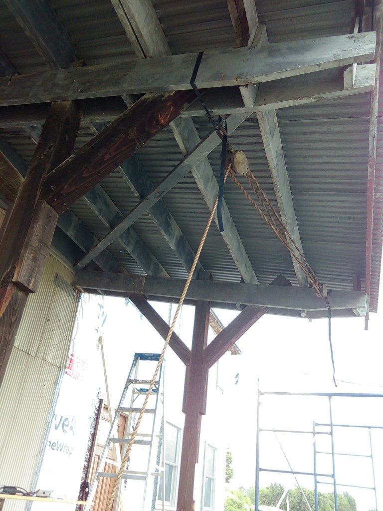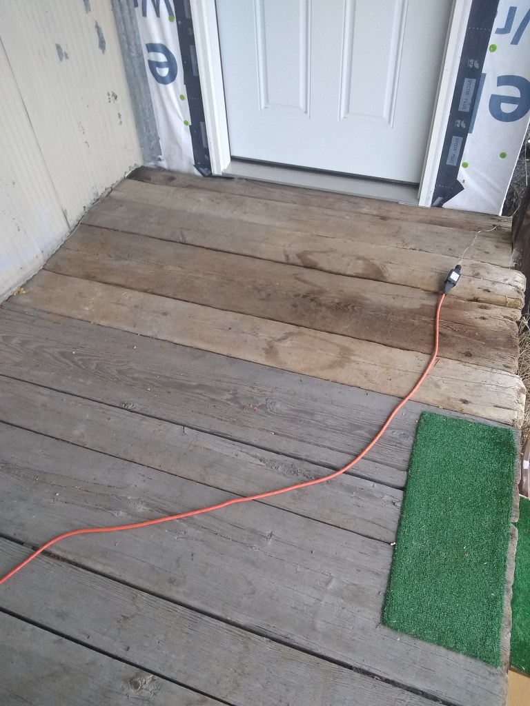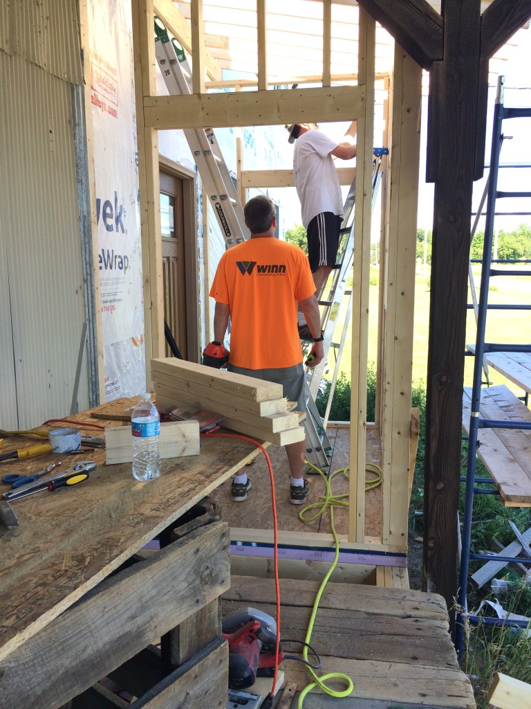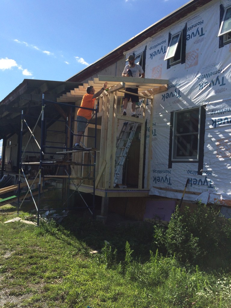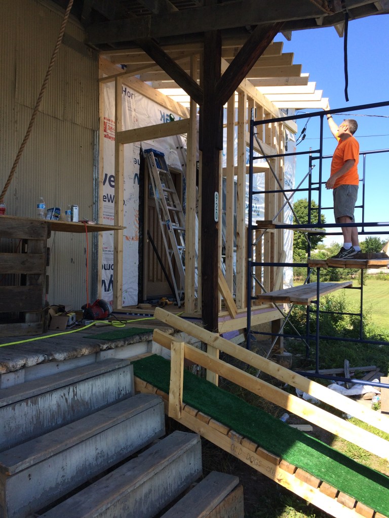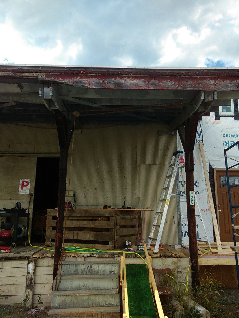 Ed came up to help again on the front of the building. We framed out a couple windows, front door, and removed the porch. That thing came down scarily hard, and fast.