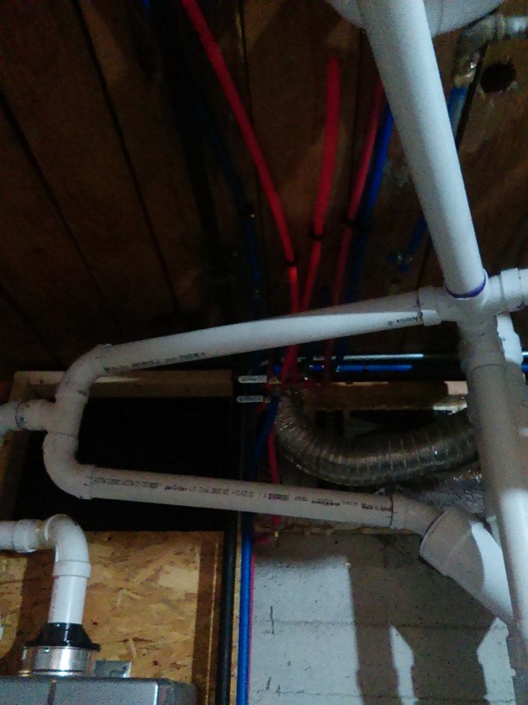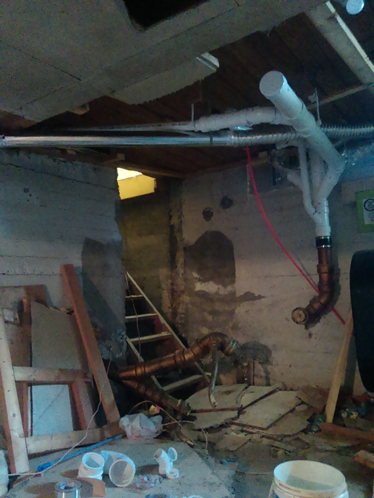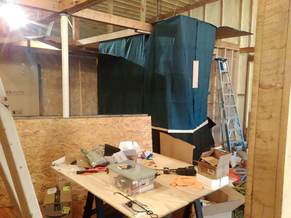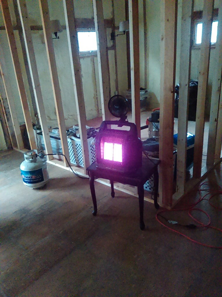 Yes, we’re well into winter now and all the insulation has been removed from the place so we’re not exactly working in the comfort of warmth now. But we needed some heat to keep the incoming water from freezing up and for now we’re just heating the basement. We also ran a small vent off one of the heat return vents into the bathroom to keep the toilet from freezing. The walls of the bathroom got covered with blankets from Harbor Freight: