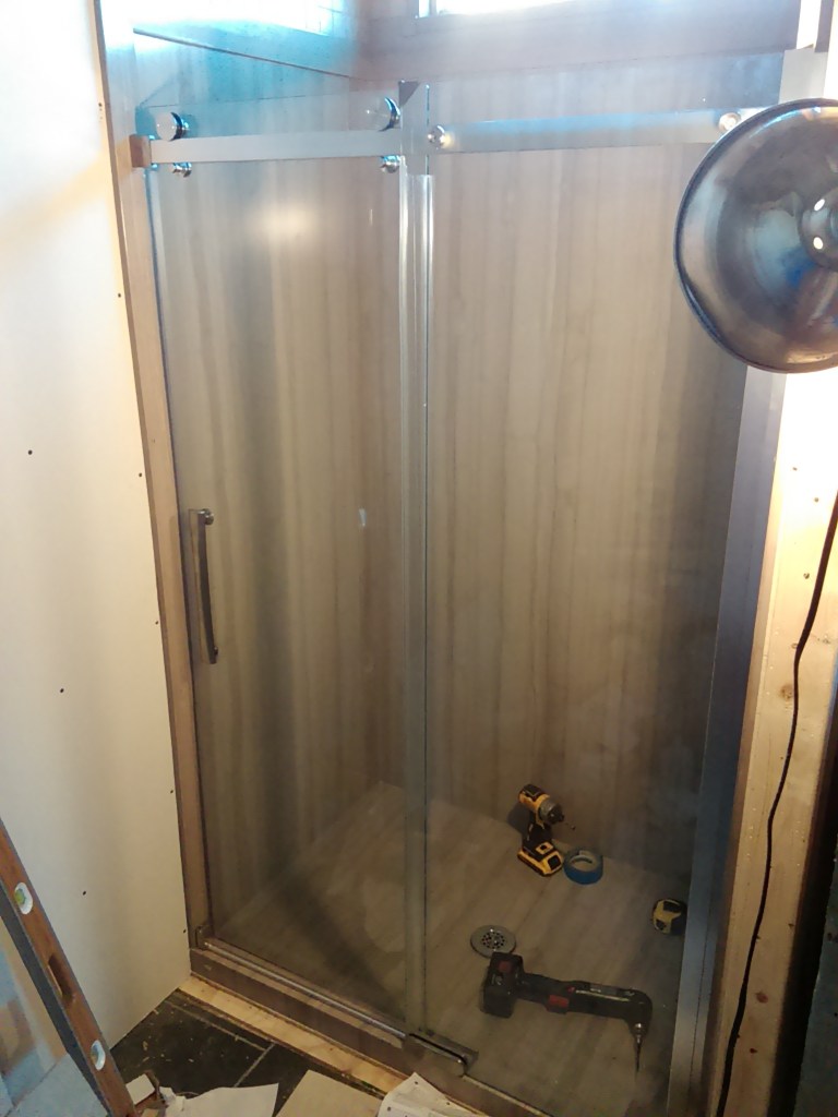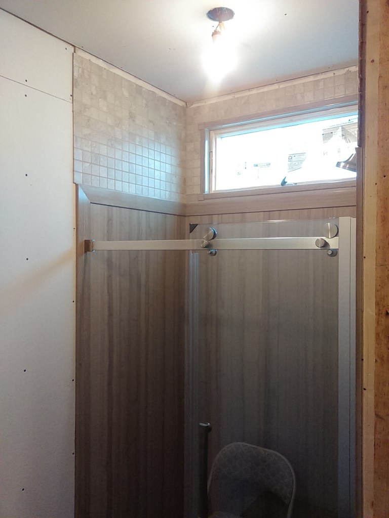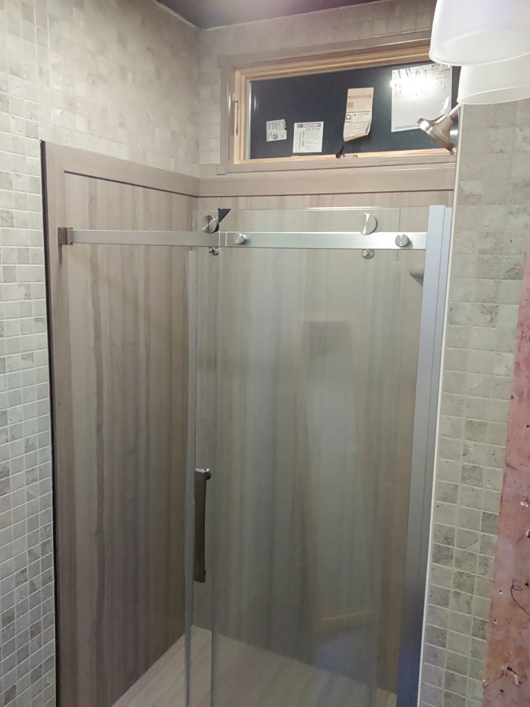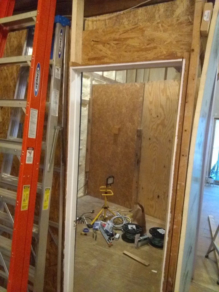 After getting the bathroom framed up I started installing the door between the warehouse and warehome. After finishing the door framing (had to widen the old door from 48″ to 60″ and beef up the existing framing) I got to the end of that day and knew I was to tired to be messing with the door but I REALLY wanted to see what it looked like in place. Needless to say, I shouldn’t have messed with it. I was removing some side carry handles and the entire door completely fell over, taking me with it. I don’t know how it didn’t explode with glass everywhere. The paint took a little damage, I had a few bruises, but the door held up surprisingly well. A little damage here on the molding around the window, there was some more where the doors meet-