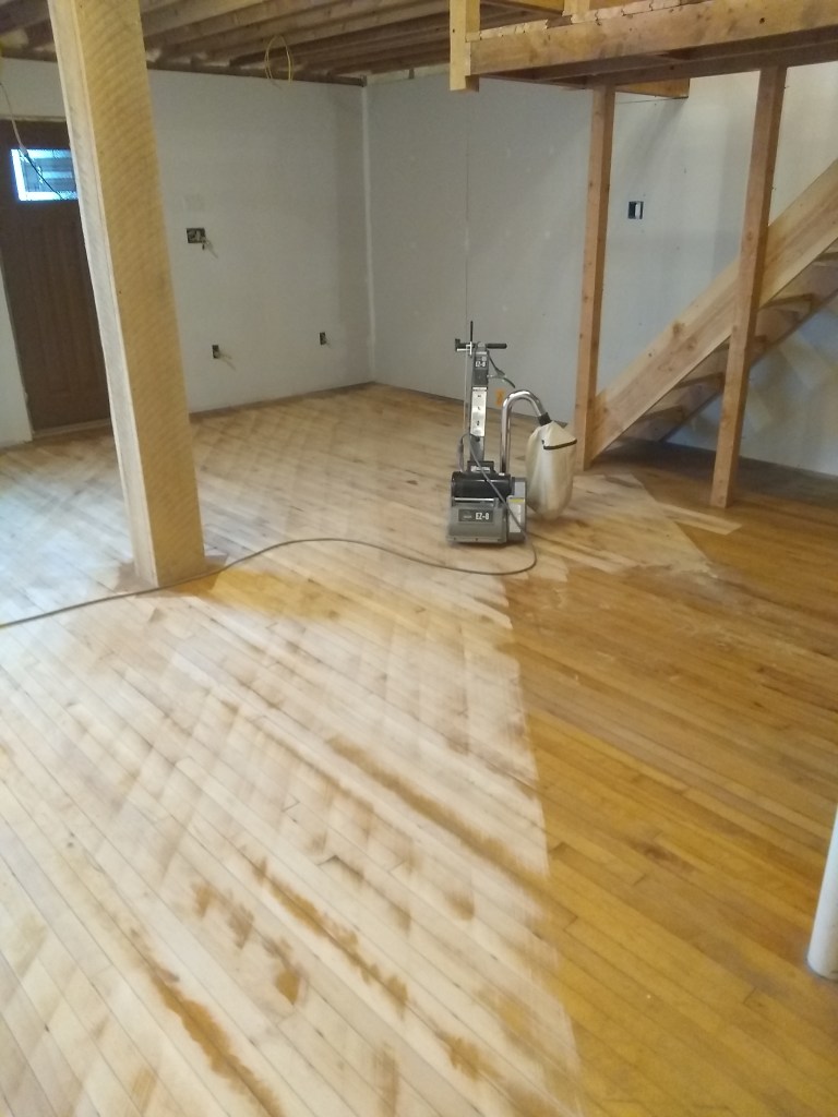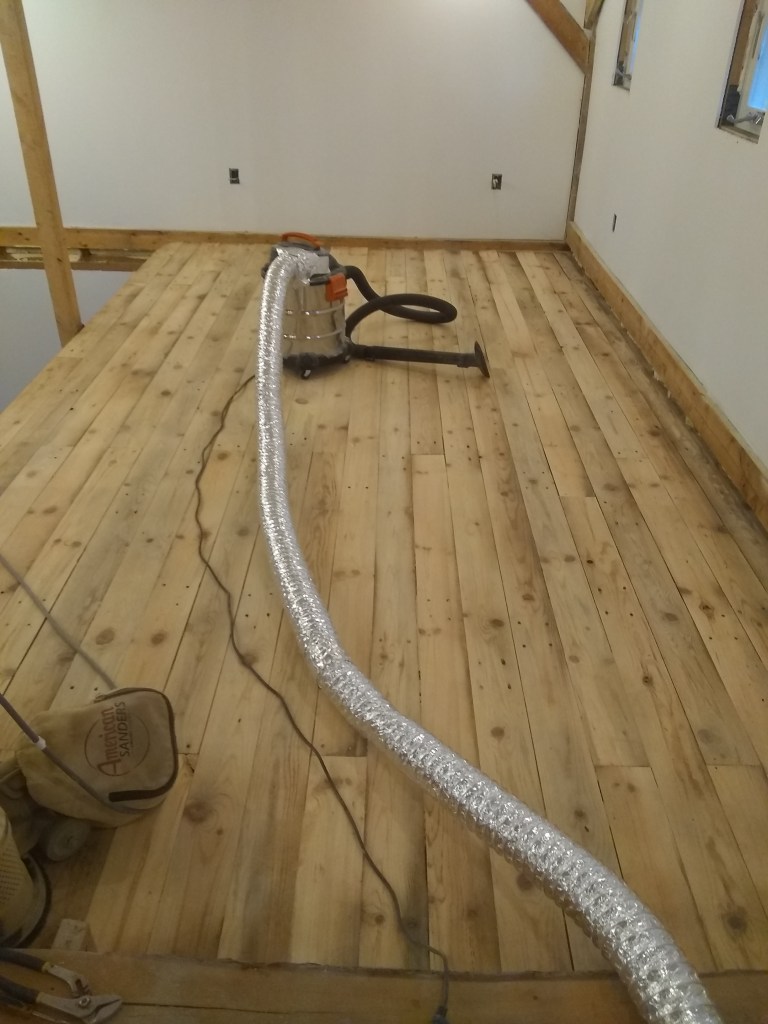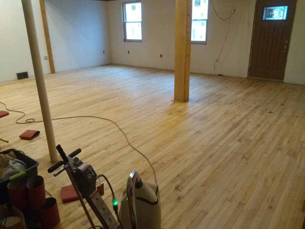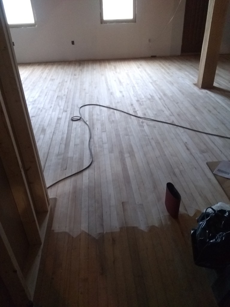 Never sanded a floor before. If you’re thinking about doing it, I highly don’t recommend it. I researched some stuff about sanders before renting, and it sounded like a random orbital would do the job. So, 45 minute drive each way to Glens Falls Home Depot to rent one. Then, finding out that it won’t cut the mustard, so another trip to and fro to get a drum sander. Many many hours and several breaker trips later, it was done.