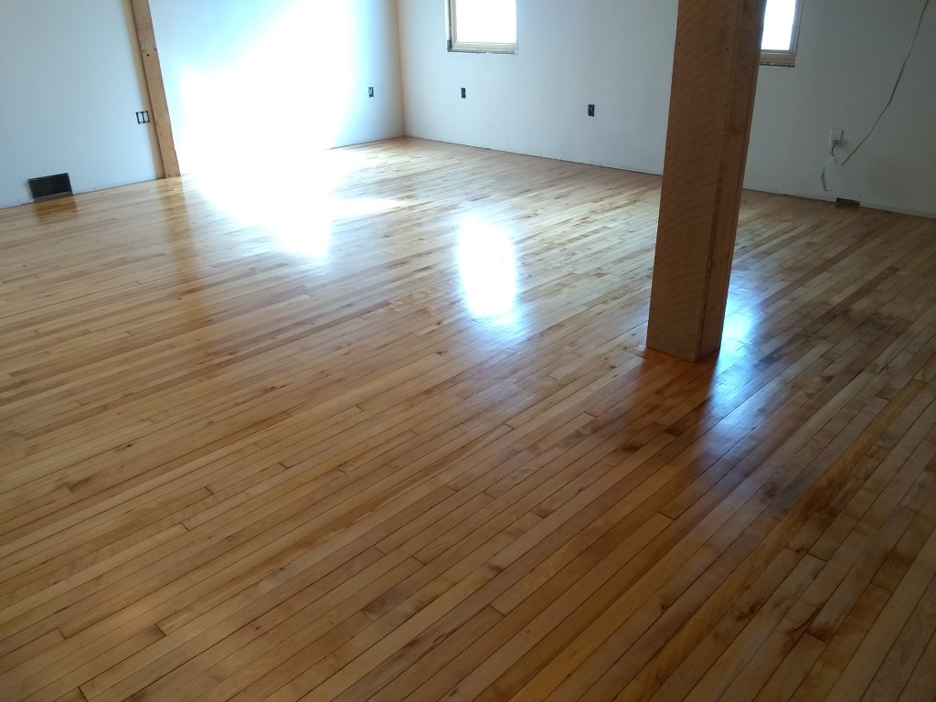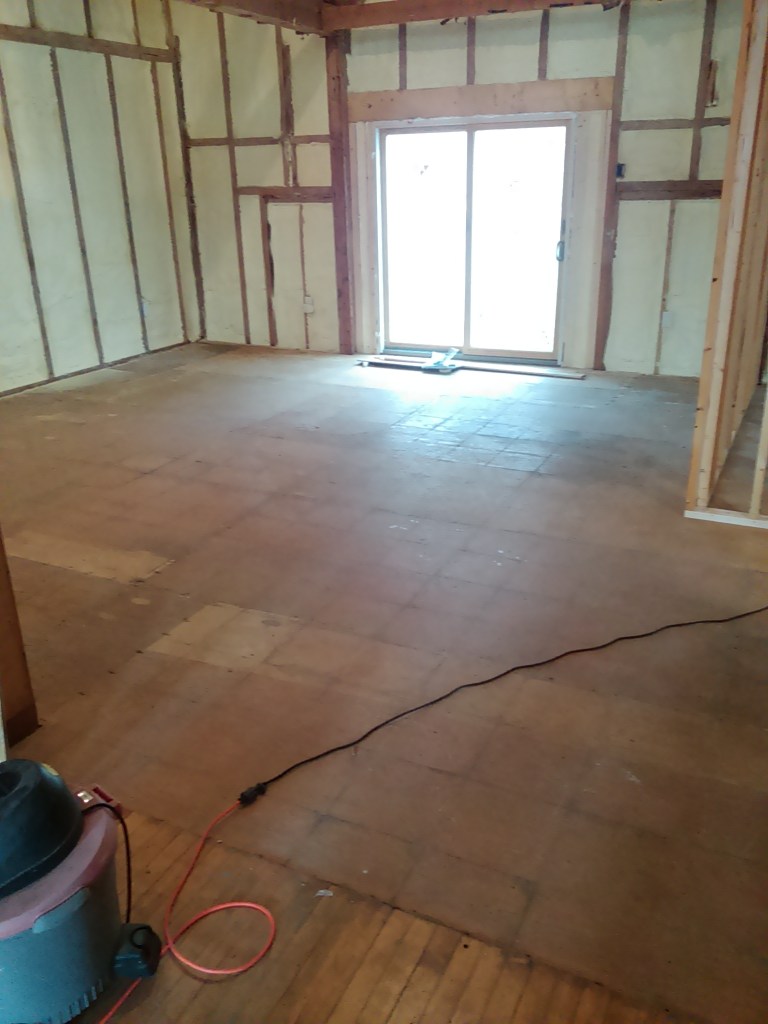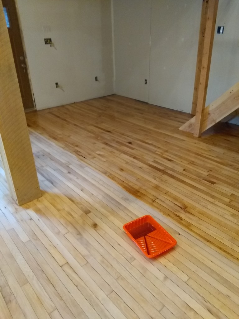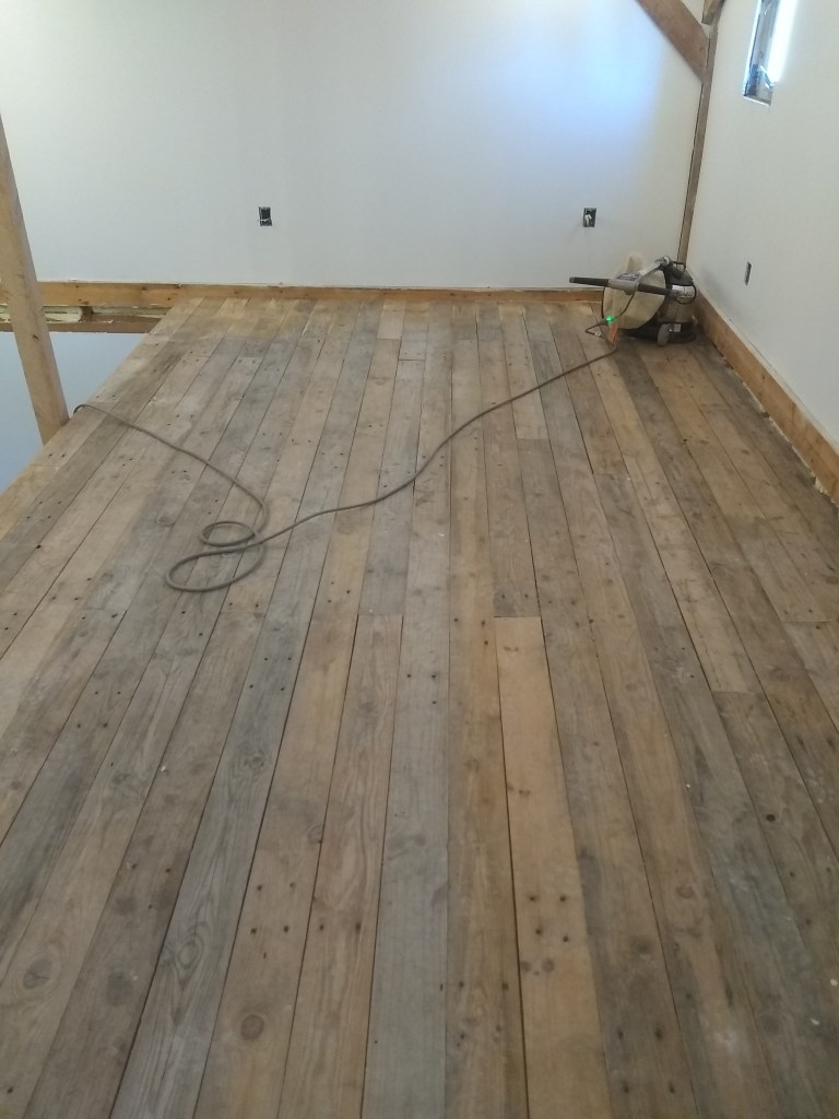 Never sanded a floor before. If you’re thinking about doing it, I highly don’t recommend it. I researched some stuff about sanders before renting, and it sounded like a random orbital would do the job. So, 45 minute drive each way to Glens Falls Home Depot to rent one. Then, finding out that it won’t cut the mustard, so another trip to and fro to get a drum sander. Many many hours and several breaker trips later, it was done.