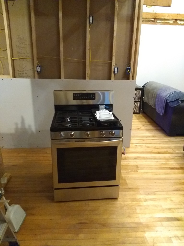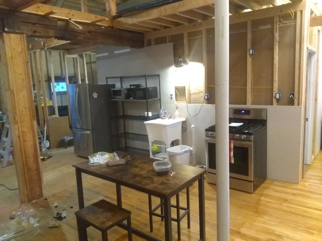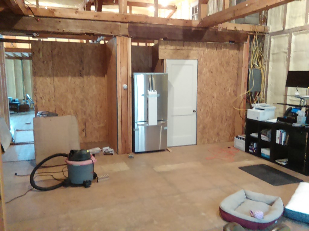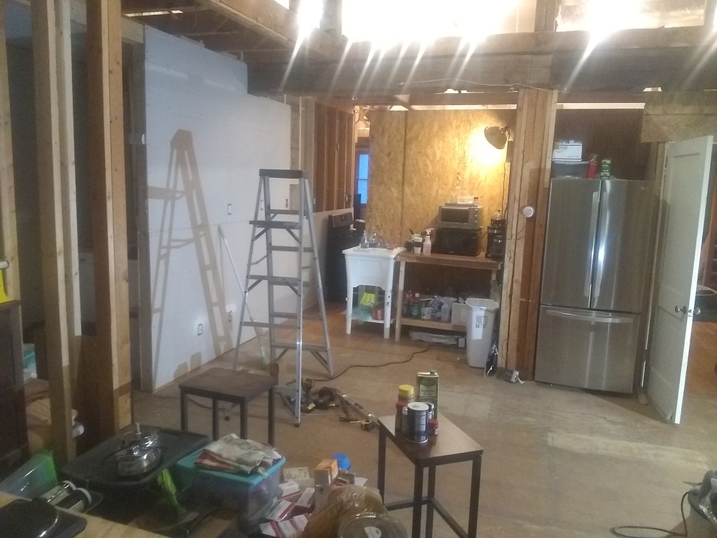 I’m sure that you’ve been following right along with the progress and remember that there is a temporary wall separating the front half and back half. We’d been living in the unfinished back half while we worked on the front. Now that the front is progressing we moved our living room to the front. We’re about to remove the temporary wall. Here you can see the fridge and sink space set up against that temporary wall, with the future kitchen space and wall on the left-