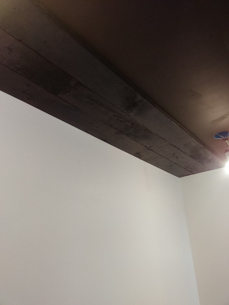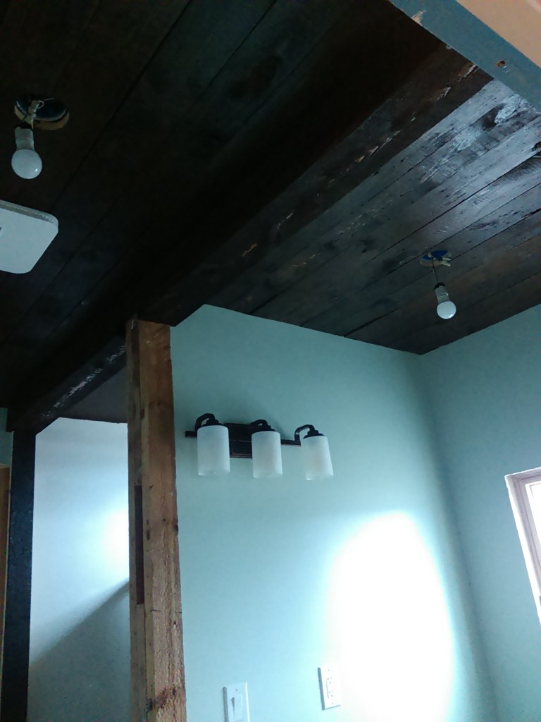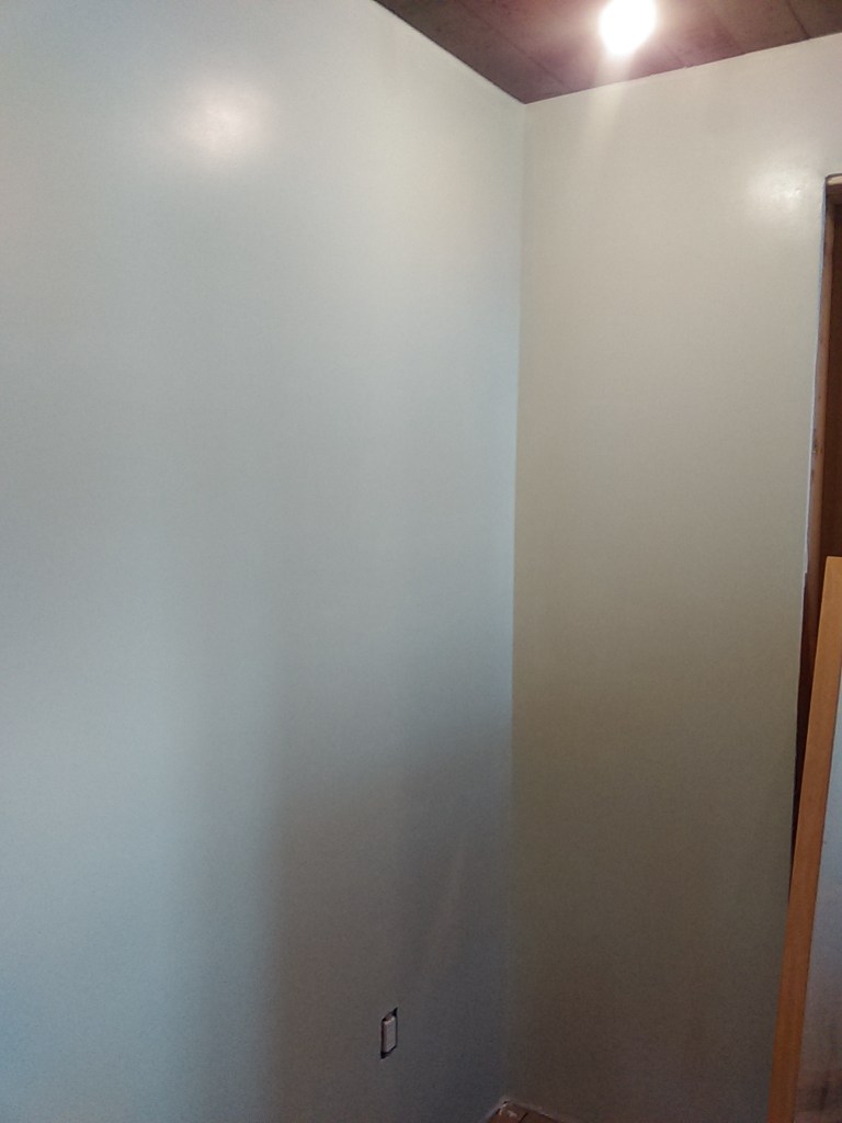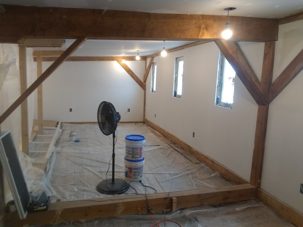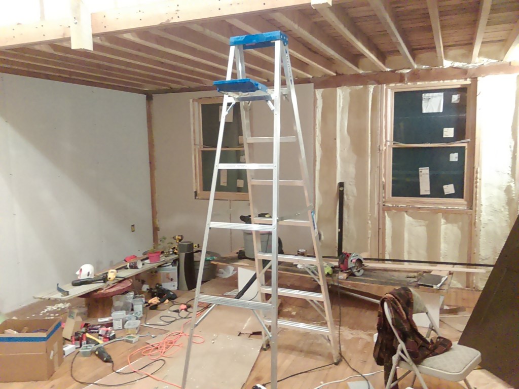 After a lot of work the sheetrock on the ceiling was finally finished up- hung, taped and mudded, and primered. At some point I’ll go back and add trim along the wood beams and clean all that up and finish the front half. That will probably involved moving some things like the living room to the back of the warehome again, but for now we can get moved from the back of the house into the front and start making some progress on the back side of the house.
