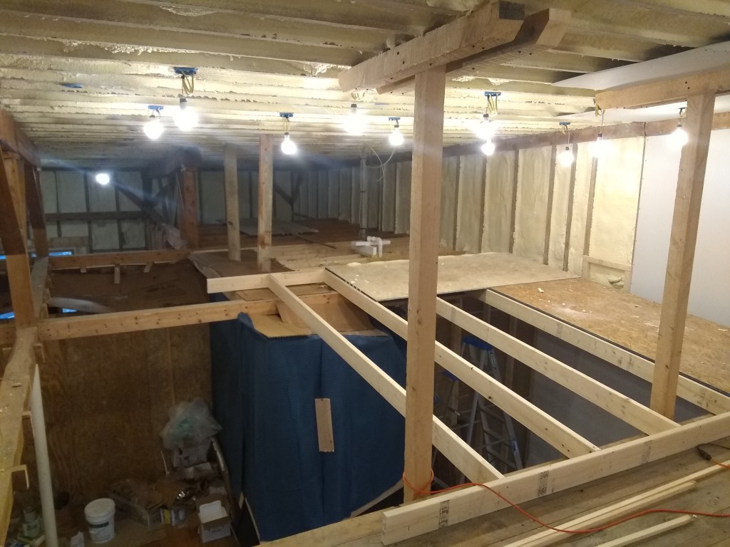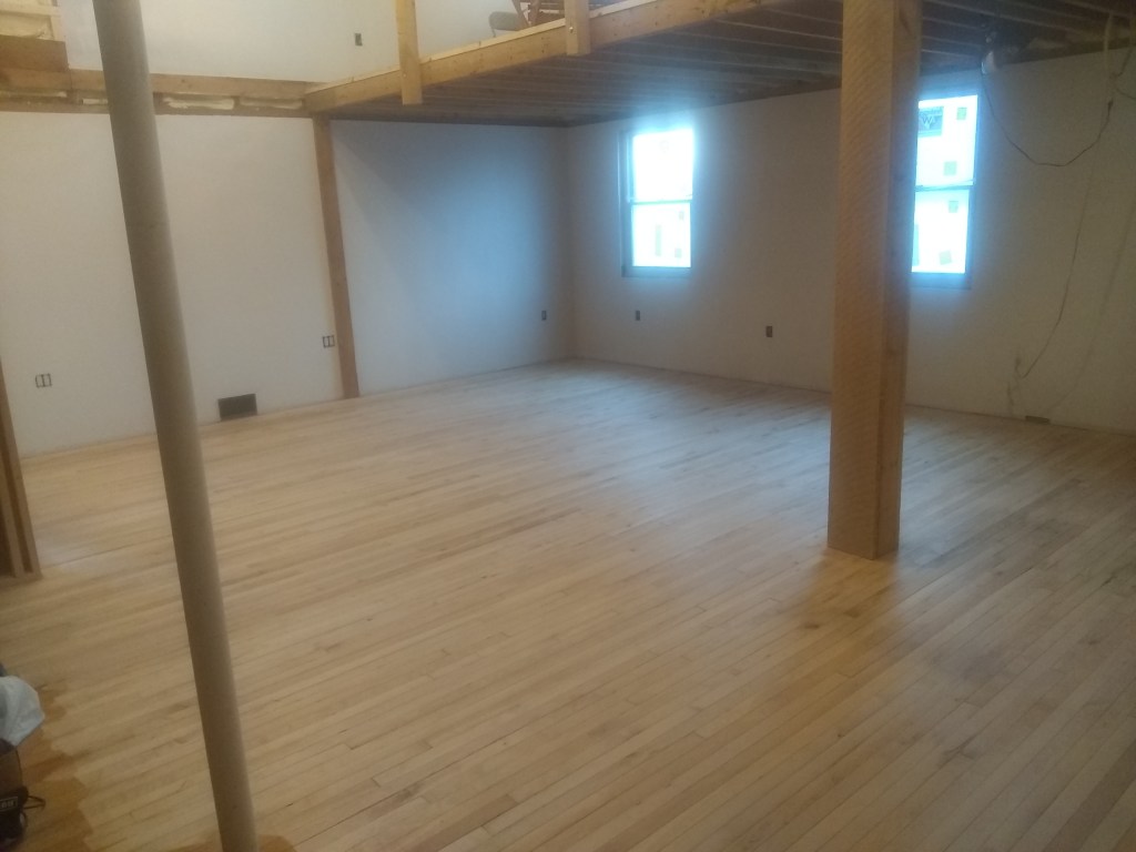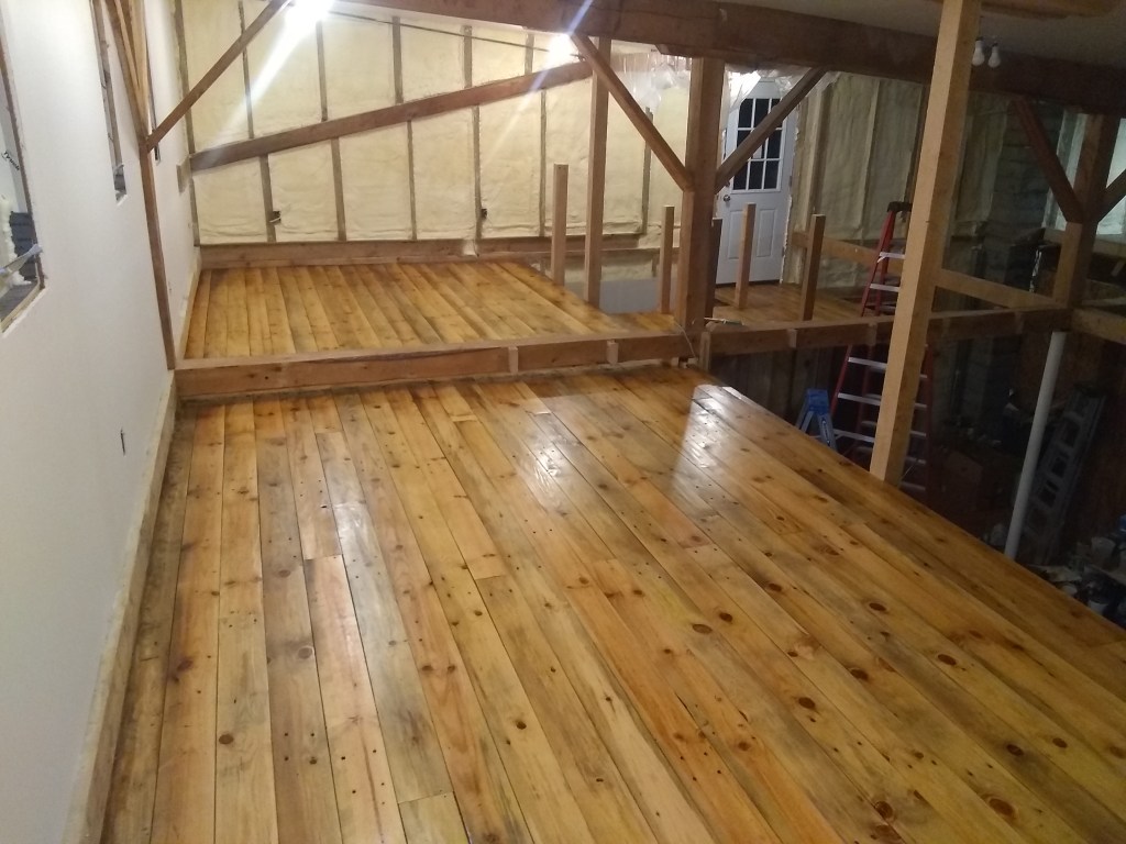Was able to finally remove all the temporary scaffolding that I’d built to work on the ceiling. Nice to finally see it all opened up after a long time of having sort of a multi-level setup with the scaffolding. Now that the scaffolding is out of the way and the construction debris cleaned up, it’s time to refinish the floors.