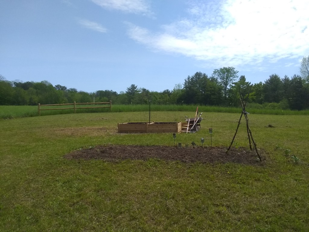 Getting our garden area started at camp. We mowed maybe an acre in the upper field and started putting up a fence- just a section or two for now- COVID has apparently shut down the pressure treated lumber scene- but will eventually go across this portion of field on the edge of the garden. Picked up a few starter plants and started planting some seeds and getting a few sprouts. The soil is pretty sticky clay so it’ll be an experiment. We have one section in the ground and then one raised bed filled with garden mix. We also started a few planters near the main camp building with flowers and herbs. And we had some perennials that we transplanted from our place in Essex that are coming back nicely (the purple flowers there, I forget their name)-