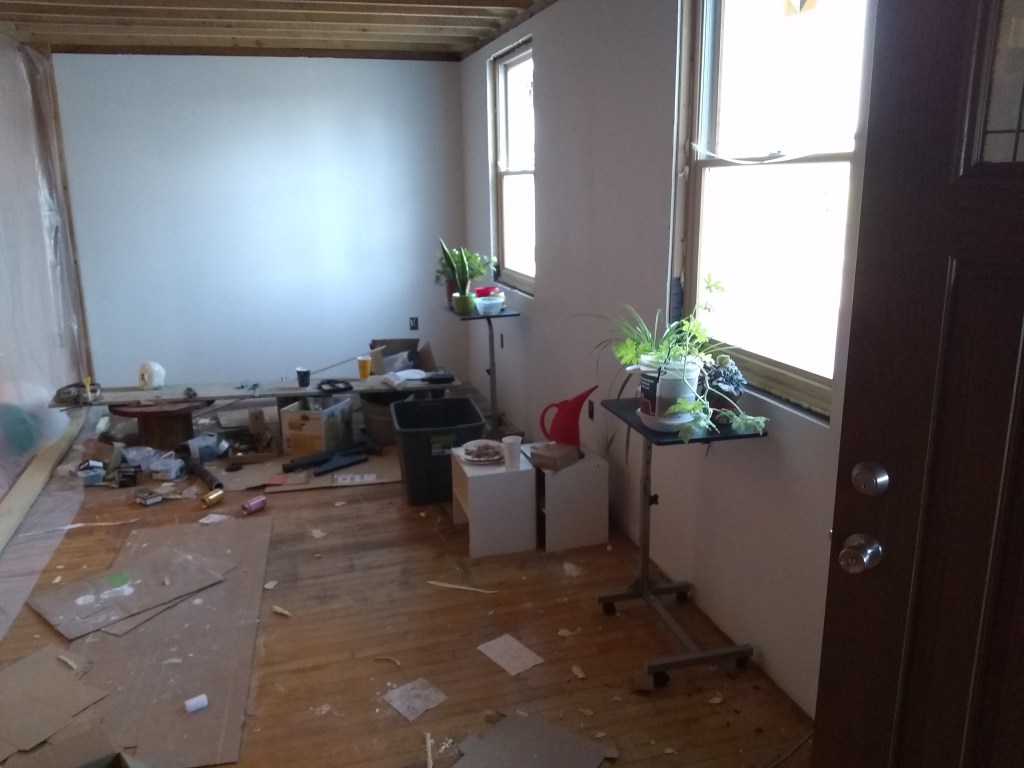 Moving our way across the ceiling with the sheetrock, from front to back. We’re still living in the rear half with a temporary wall between front and back. Rear is the stuff with spray foam showing still, and the front is the rock’d portion. Almost half done, and sliced my finger cutting a sheet pretty badly. The front area under the loft (where the plants are) is now all rock’d, mudded and primed with white paint. Nice to finally at least have some section done (altho still a bit of a mess)-