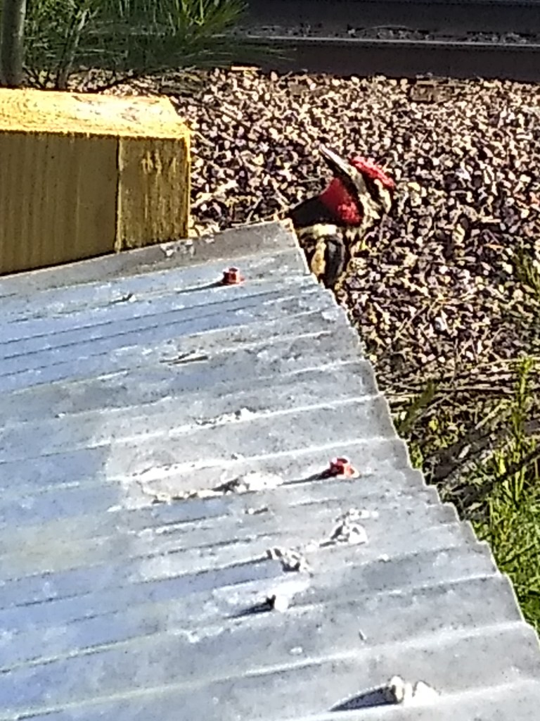 At the warehouse, we got the bird feeder out and found some leaking around the flashing of our furnace chimney. The woodpecker’s love to come-a-knockin’ in the spring. It’s actually pretty annoying-