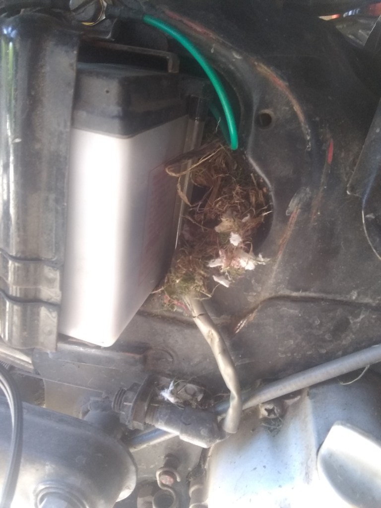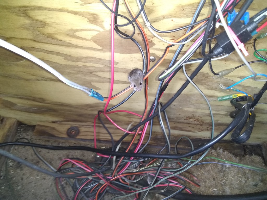 And another sure sign of the weather warming, nature is popping all around us. Mice have infiltrated everything during the colder months. This year they’ve chosen to nest in the dash of the SS Mouse Terd (aka our pontoon boat). Usually the like they live well and bimini top. They’ve also chosen a tight spot in the battery compartment of one of my trail bikes-