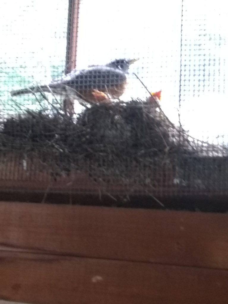 A robin has chosen to take up residence and nest in a broken window in the warehouse. I don’t think she thought this through. Every time the sun shines hot I think her and her babies are baking. I see them in there with their heads up and their mouths wide open-