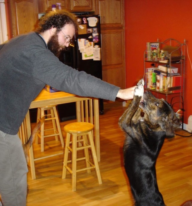 But his people-recognition skills were crazy. Some people he would meet (well, more like smell, I guess) and immediately they were OK in his book. He’d meet some strangers to him that I’m pretty sure he liked more than me. Other people he might even growl at. And if you were on his dislike or like list, he wouldn’t forget. You might not see him for months but then when you did, he remembered you. And continued liking (or disliking) you just as much as the last time he saw you. But he was never aggressive or anything like that. He’d just let you know where you stood. Worse case he’d skulk around and give you dirty looks. We used to joke that he was using his powers of mental telepathy and/or telekinesis on people (which, despite years of practice, he was never able to apply to opening a door successfully).
